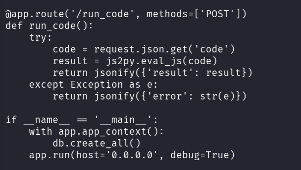 The app passed untrusted user JS directly into js2py.eval_js() allowing attacker-supplied code to run on the server.