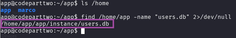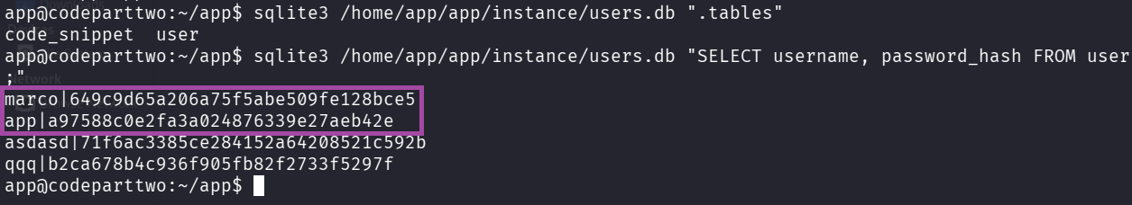 appuser - Lateral Movement: Extracted SQLite database with marco’s MD5 password hash