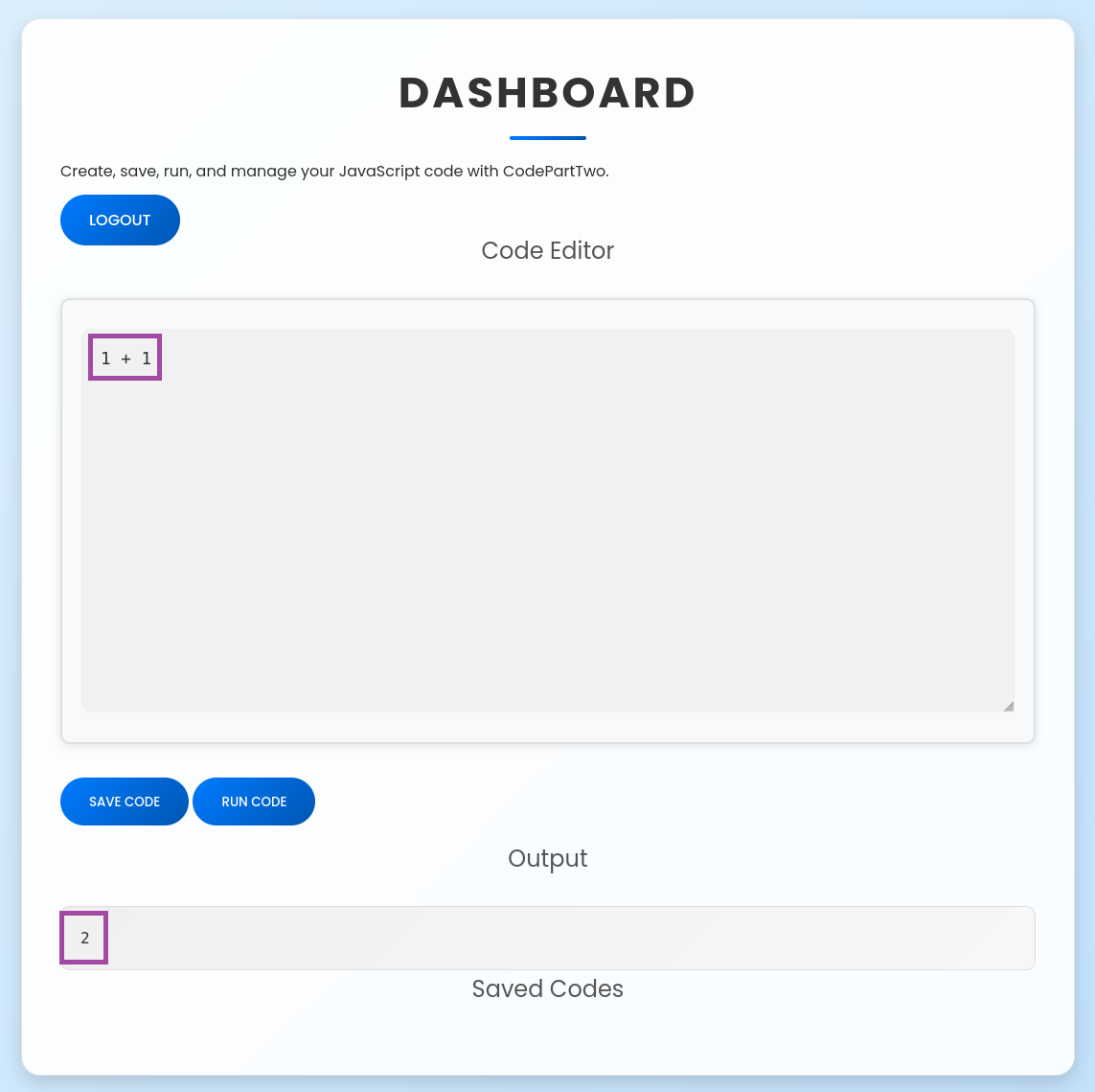 - A landing page for “CodePartTwo” - a JavaScript code editor
