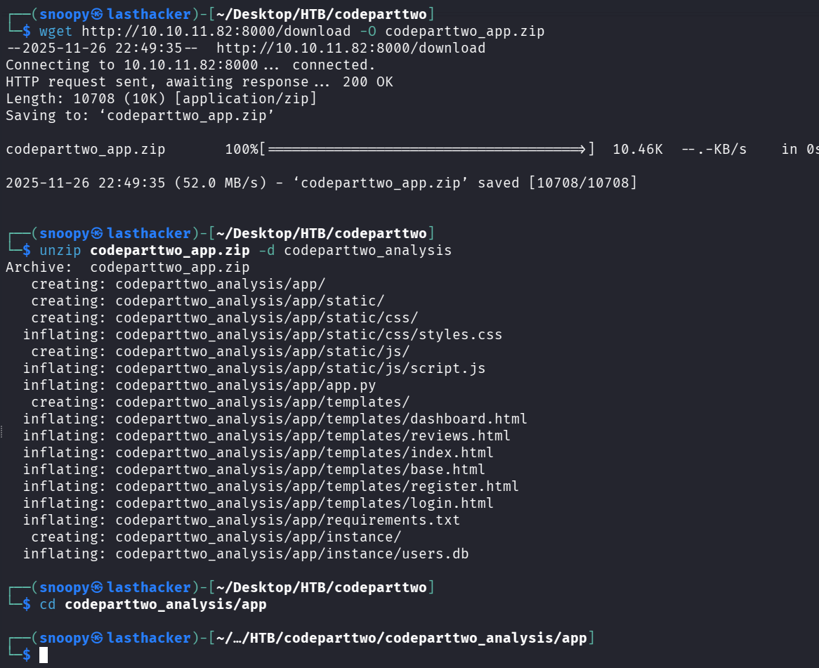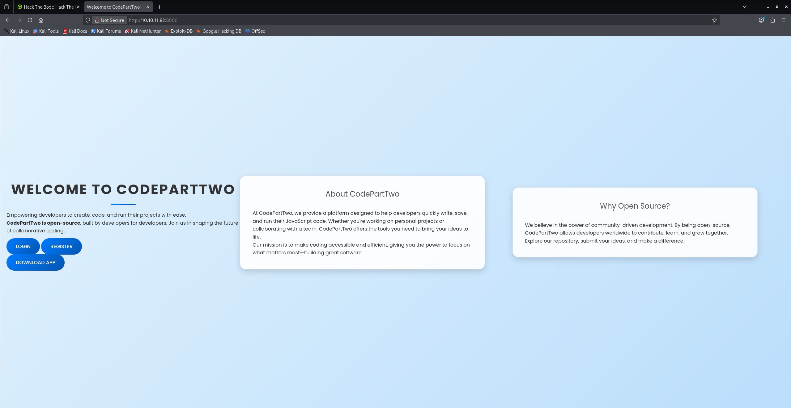 echo "10.10.11.82 codeparttwo.htb" | sudo tee -a /etc/hostsWhat this does: Maps the IP address to a hostname so you can use codeparttwo.htb instead of typing the IP every time.