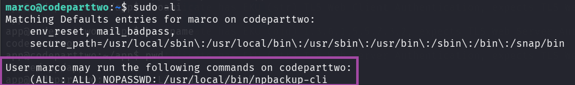 marco had NOPASSWD rights to /usr/local/bin/npbackup-cli and the tool accepted custom config files. Running it as root allowed backing up and extracting /root, exposing root.txt and private keys.