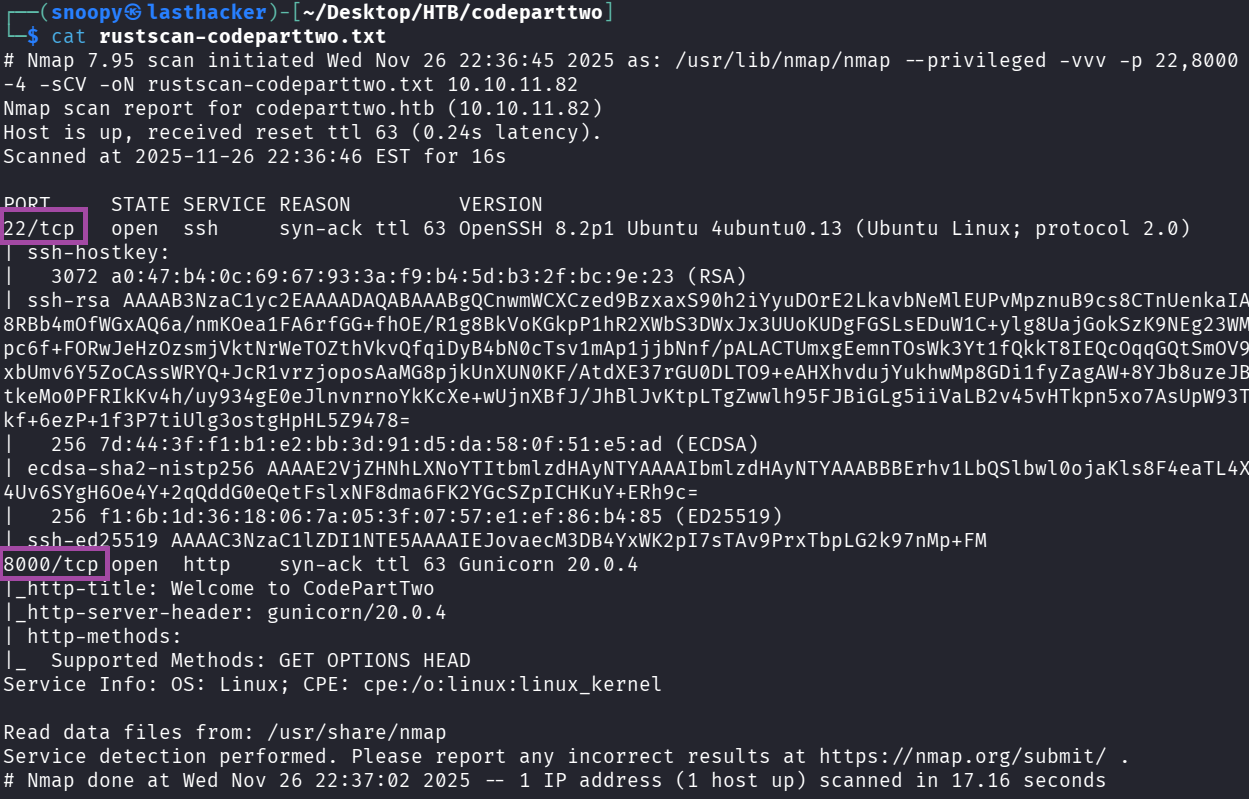 rustscan -a $IP: Scan the target IP-r 1-65535: Scan all ports from 1 to 65535--ulimit 5000: Set file descriptor limit for faster scanning-- -sCV: Pass these flags to Nmap (service version detection + default scripts)-oN rustscan-codeparttwo.txt: Save output to a file