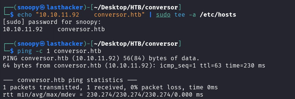 echo "10.10.11.92 conversor.htb" | sudo tee -a /etc/hostsVerify it works:
