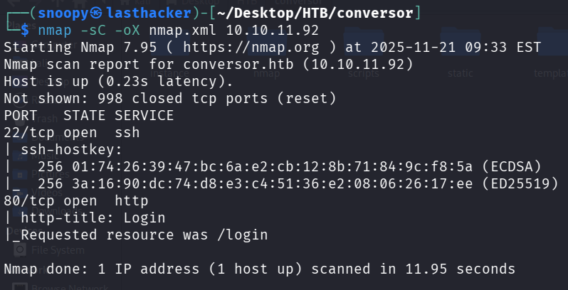 nmap- The network scanning tool-sC- Run default scripts (safe enumeration scripts)-sV- Detect service versions-oA nmap/initial- Save output in all formats (nmap, gnmap, xml)10.10.11.92- Target IP address