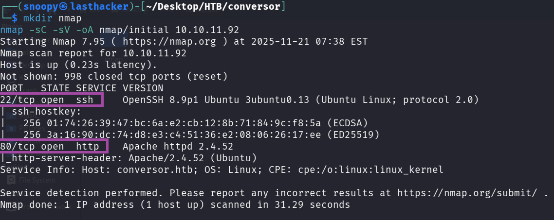 Service Info: Host: conversor.htb; OS: Linux; CPE: cpe:/o:linux:linux_kernel