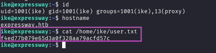 uid=1001(ike) gid=1001(ike) groups=1001(ike),13(proxy)