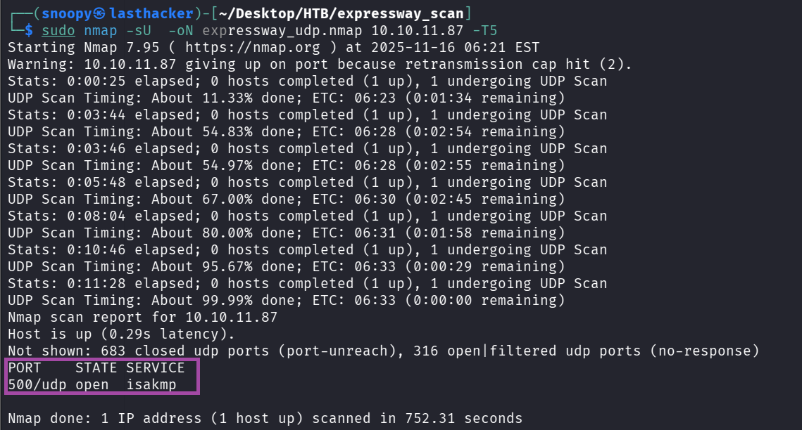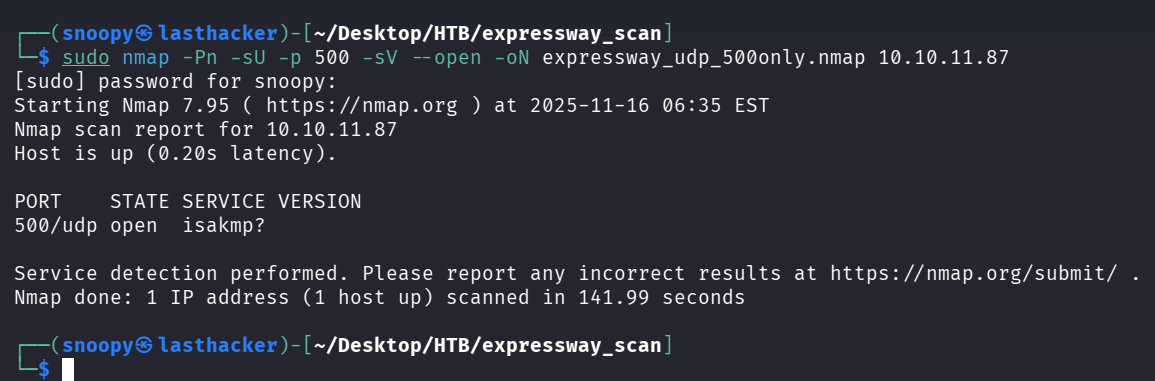 sudo nmap -Pn -sU -p 500 -sV --open -oN expressway_udp_500only.nmap 10.10.11.87Output: