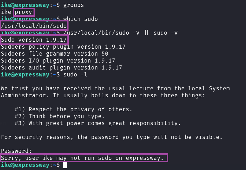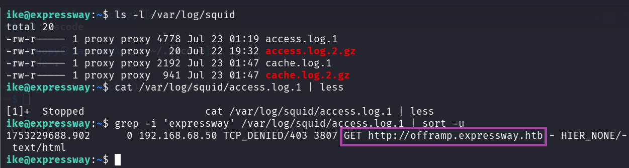 User ike could read /var/log/squid/, exposing offramp.expressway.htb, which mattered for sudo bypass.