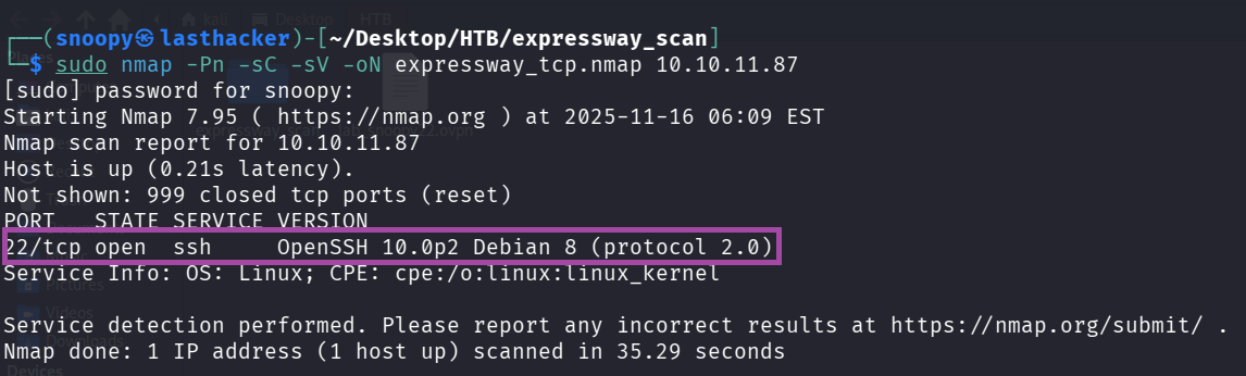 sudo nmap -Pn -sC -sV -oN expressway_tcp.nmap 10.10.11.87Output
